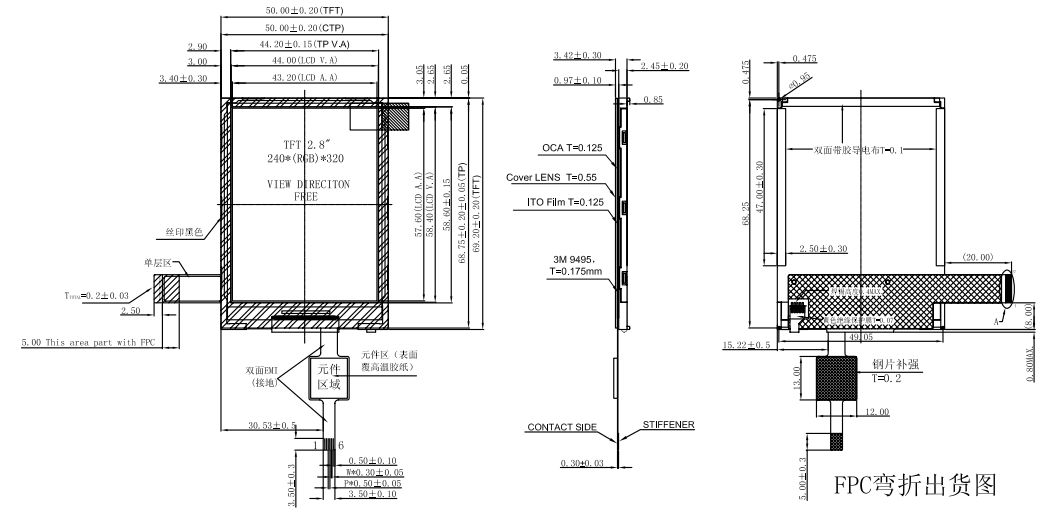 Production Drawing of the 2.8 inch 240x320 LCD Touch screen