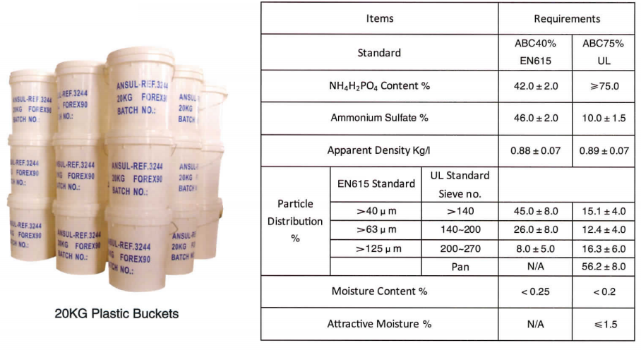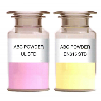 The ABC dry powder extinguishing agent use ammonium phosphate as a basic firefighting material. It can be filled in portable, cart fire extinguishers, mobile and stationary appliances or fixed installations. It is suitable for putting out solid substance fires (class A fires), combustible liquid fires (class B fires) and gas and electric equipment fires (class C fires).