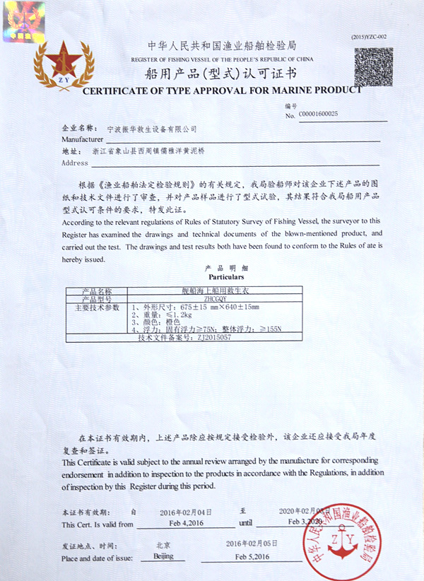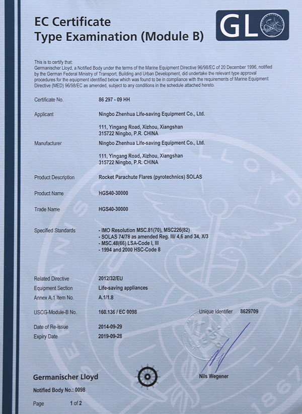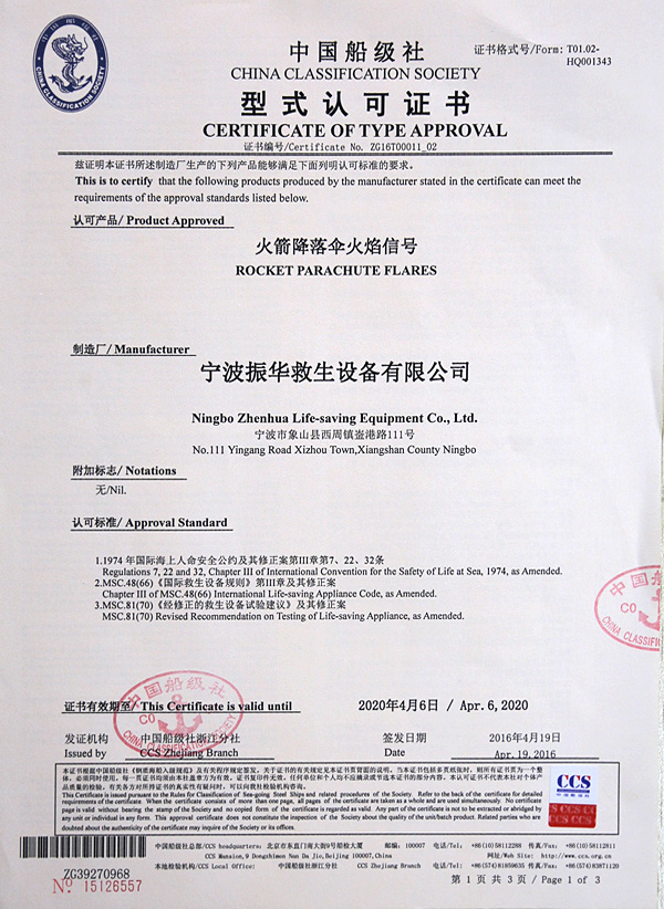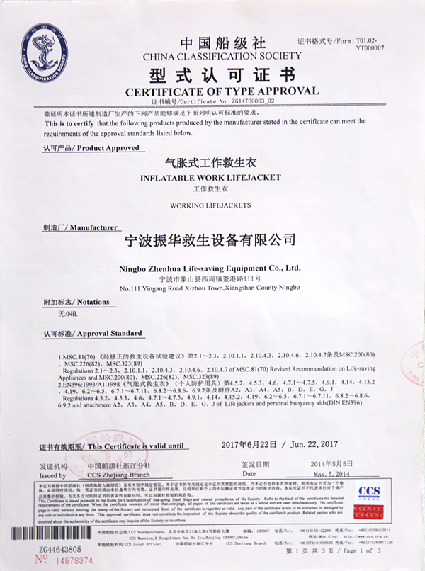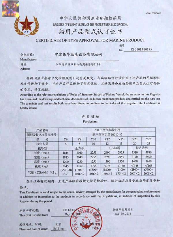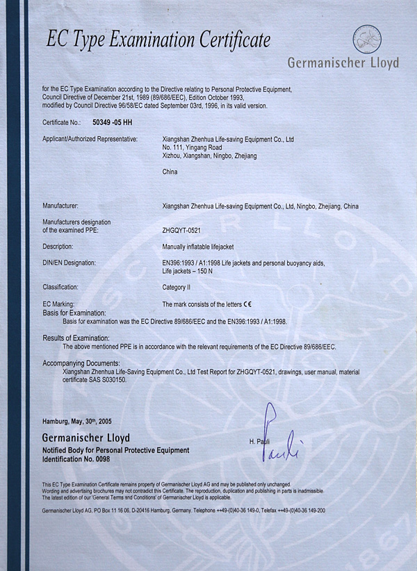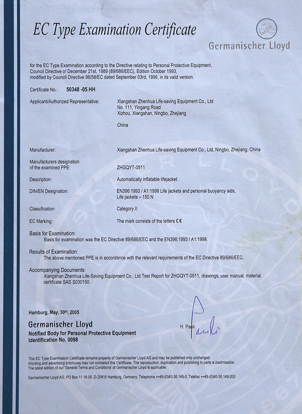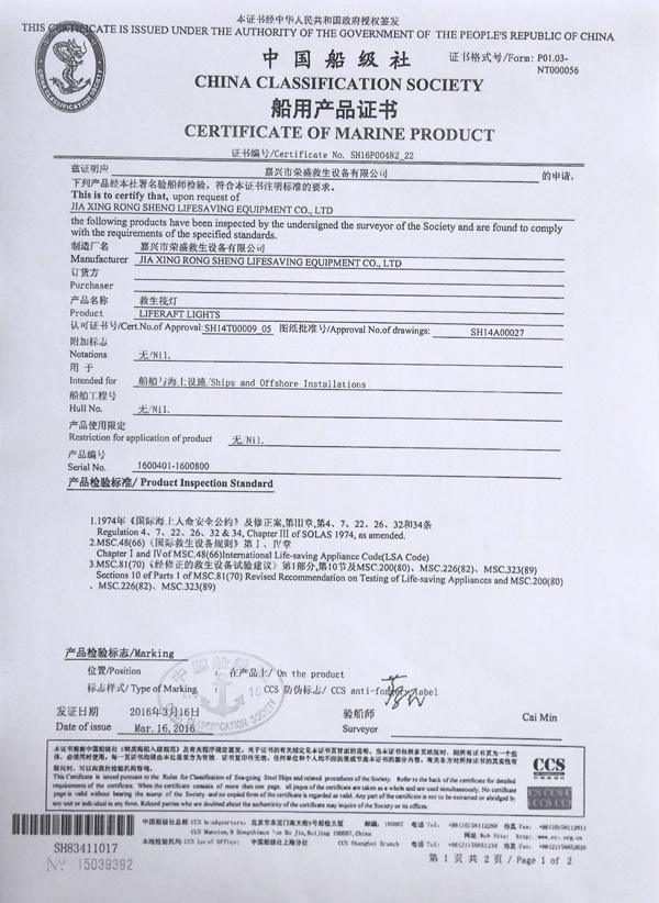 The company has a complete ISO9001 production management system, marine life-saving fireworks signal products, inflatable life jacket series products; strictly in accordance with GB4541-4543-91 standards and SOLAS, LSA and MSC.81 (70) and other international standards for production, products Approved by CCS of China Classification Society and Fishery Ship Inspection Bureau of the Ministry of Agriculture, and passed the CE certification and Australian certification of Lloyd's Register of Shipping, the product has obtained a number of utility model patents.